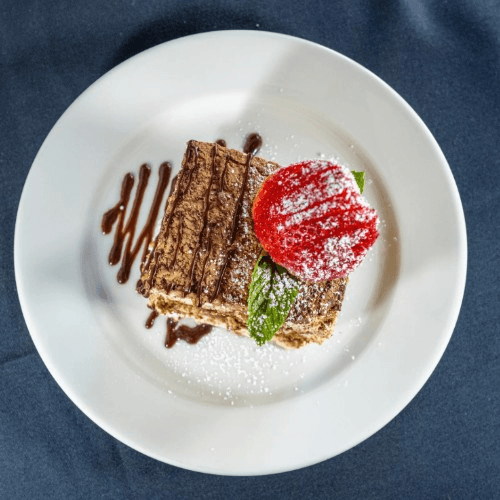 Ladyfingers dipped in coffee, layered with cream & chocolate.