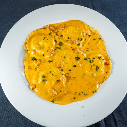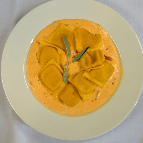 Square butternut squash filed pasta, topped with tomatoes, basil, garlic, olive oil & vodka sauce