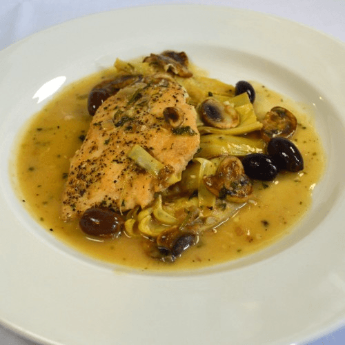 Sautéed chicken breast with mushrooms, kalamata olives, artichoke hearts, & white wine sauce