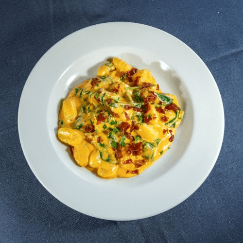 Homemade gnocchi, crispy prosciutto, & spinach in a four-cheese rose sauce