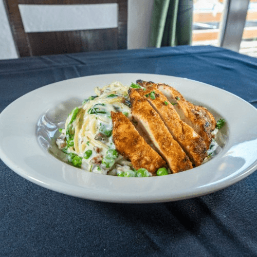 Crispy bacon, spinach, green peas, tossed in a white cream sauce over spaghetti. Your choice of sautéed chicken or blackened chicken.