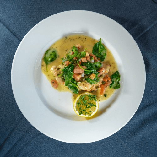 Sautéed chicken breast with fresh tomatoes, spinach, lemon & capers in a white wine sauce. Guest's choice of side