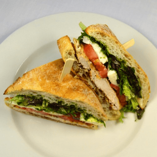 Grilled chicken, tomato, fresh mozzarella, spinach, pesto, drizzled with balsamic glaze & olive oil on ciabatta bread