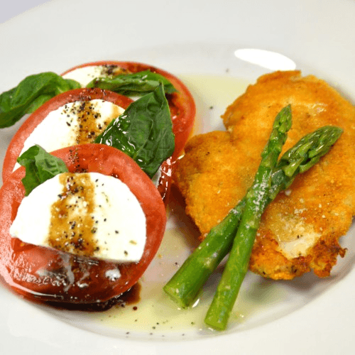 Parmesan-crusted chicken with sliced tomatoes & fresh mozzarella with a side of asparagus