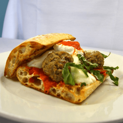Homemade meatballs in marinara sauce, ricotta cheese, fresh mozzarella, & basil, on ciabatta bread