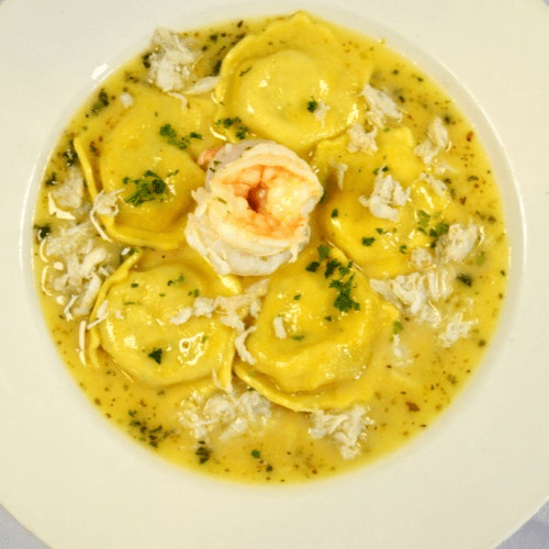 Shrimp & crab stuffed in two layered pasta & finished with a shrimp scampi sauce