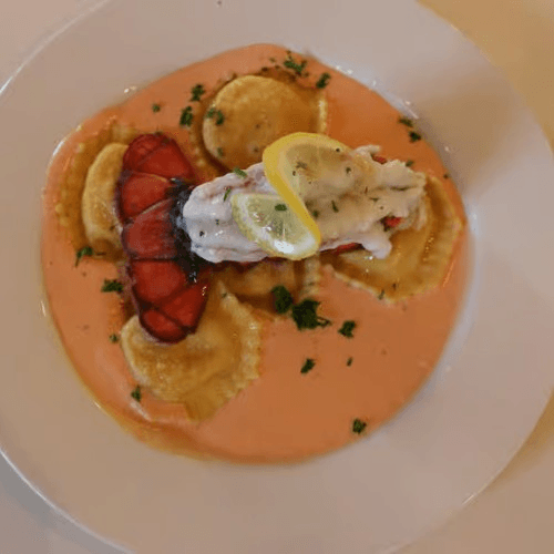 Pasta brimmed with lobster & covered in a rose sauce with a touch of brandy