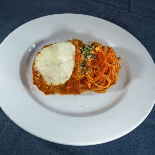 Breaded chicken breast with marinara sauce, topped with mozzarella cheese. Served with pasta