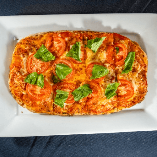 Flat bread with tomato sauce, mozzarella, basil & olive oil