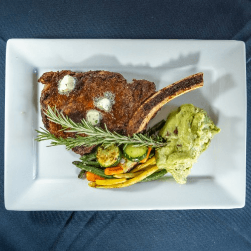 French cut bone-in ribeye topped with house-made fresh herb butter, & spices. Served with vegetables and guest's choice of side